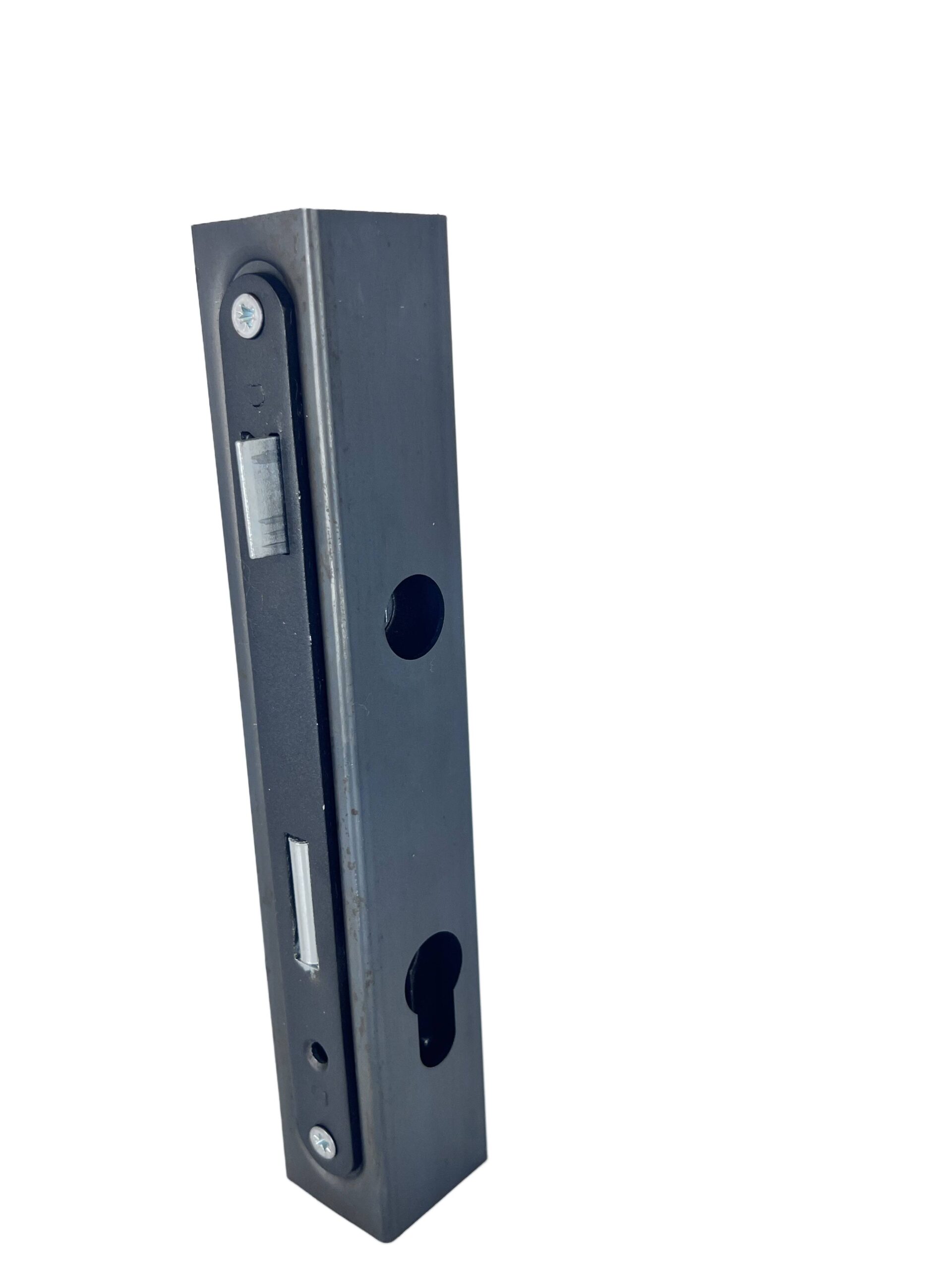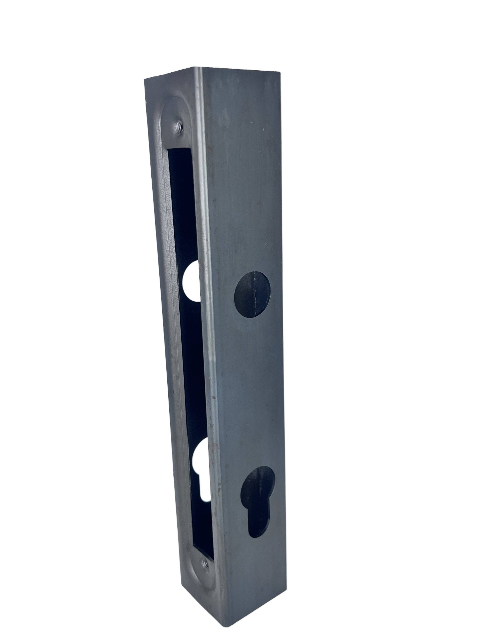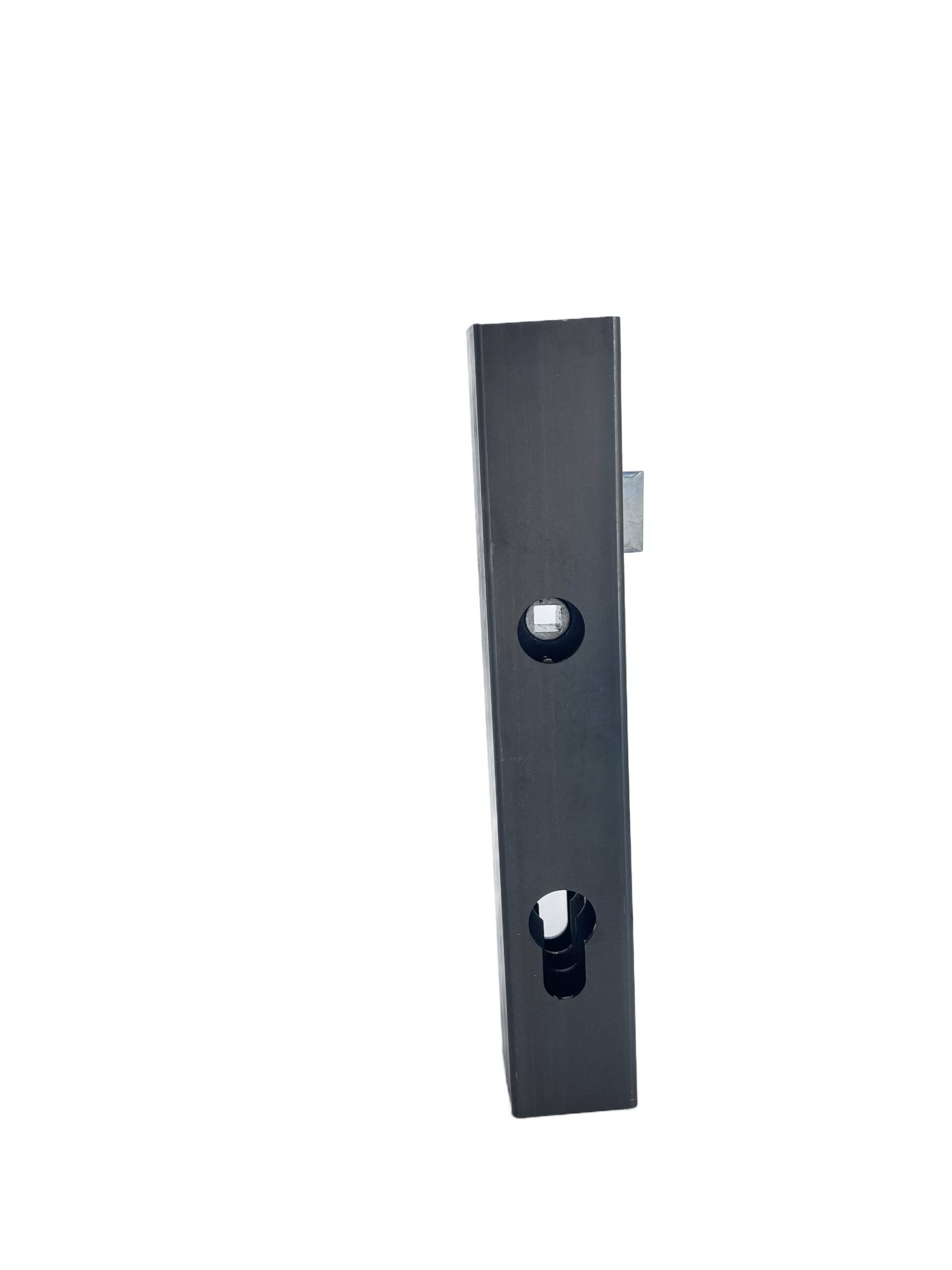 Kaseta o wymiarach 40x40 mm, wyposażona w zamek oraz specjalne wytłoczenie pod zamek, przeznaczona do drzwi i konstrukcji metalowych.