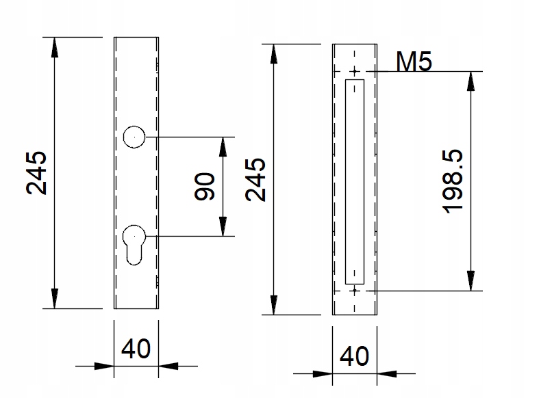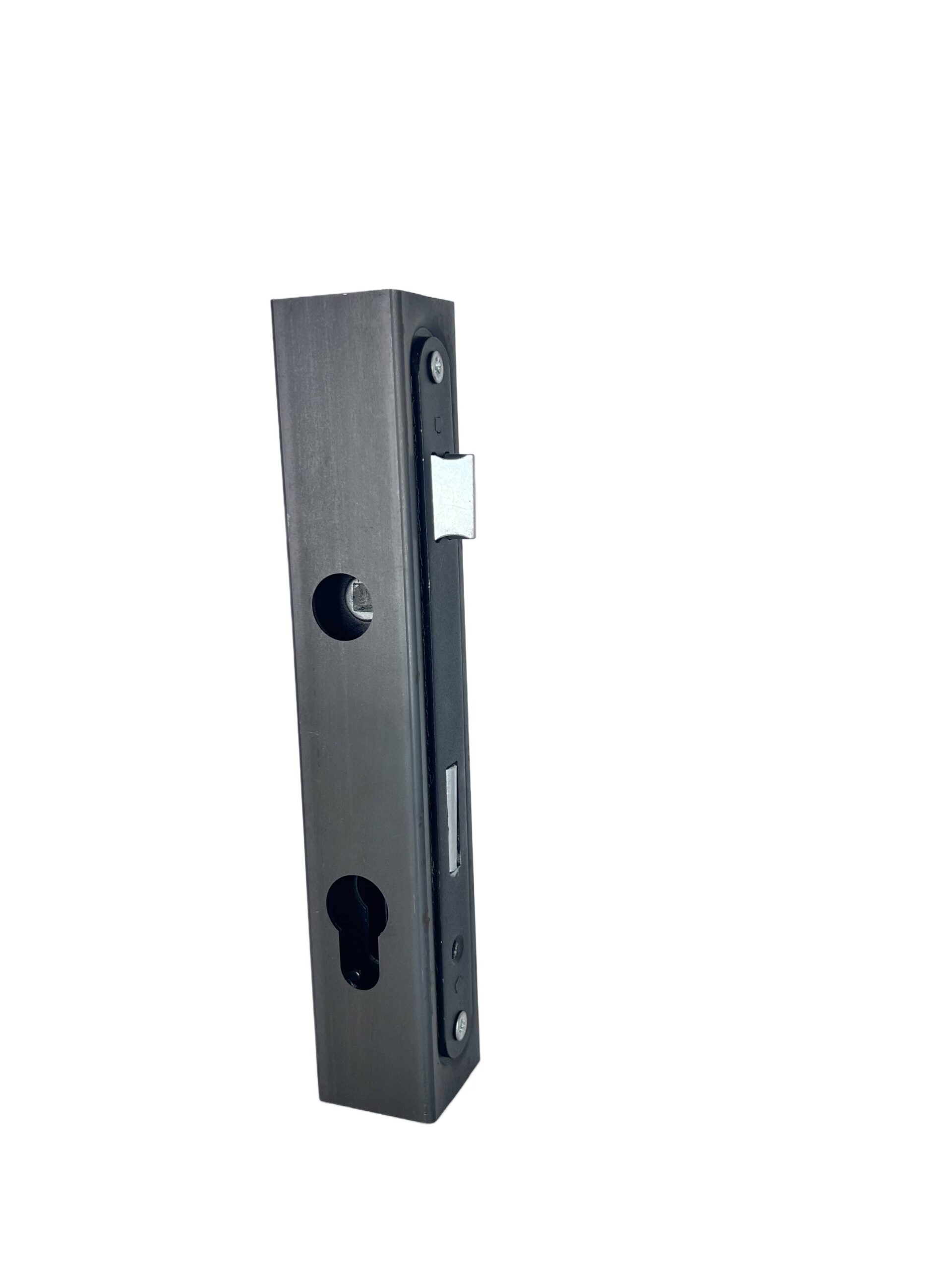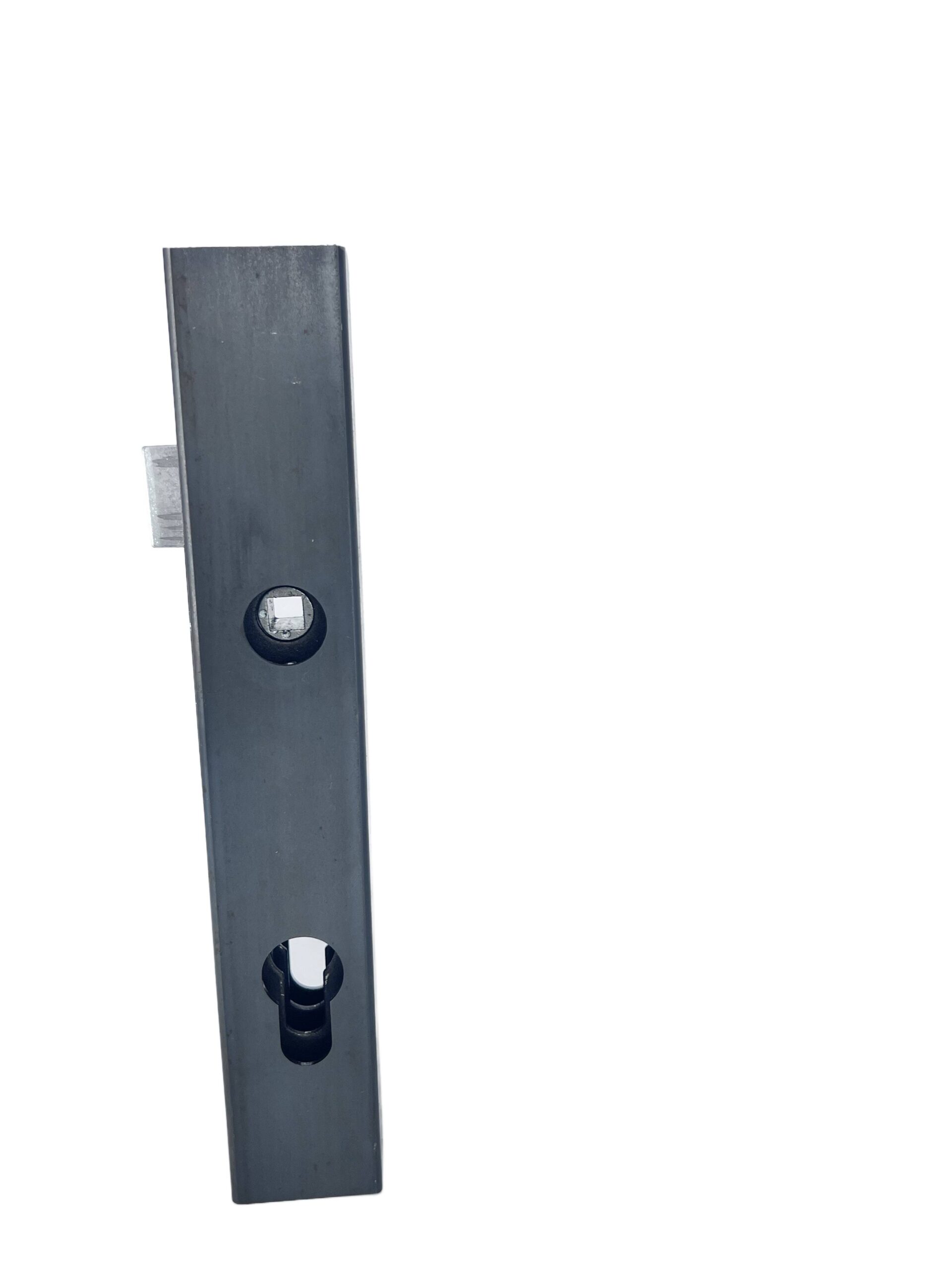 Kaseta o wymiarach 40x40 mm, wyposażona w zamek oraz specjalne wytłoczenie pod zamek, przeznaczona do drzwi i konstrukcji metalowych.