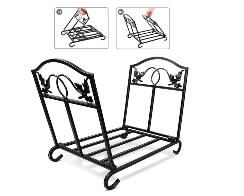 Stalowy kosz do przechowywania drewna kominkowego , wyróżnia się również kutymi zdobieniami, które dodają mu dodatkowego stylu.