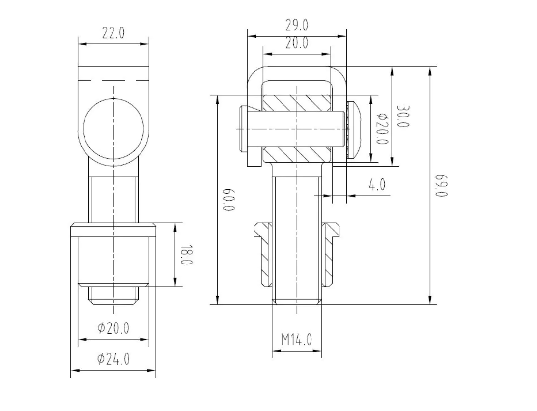 Stalowy zawias regulowany ze śrubą M14. Produkt ocynkowany (z uchem czarnym) – przeznaczony do użytku zewnętrznego, zapewnia wysoką odporność na korozję.